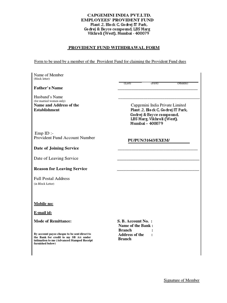 Pf Withdrawal Form Capgemini Pdf Cheque Financial Services